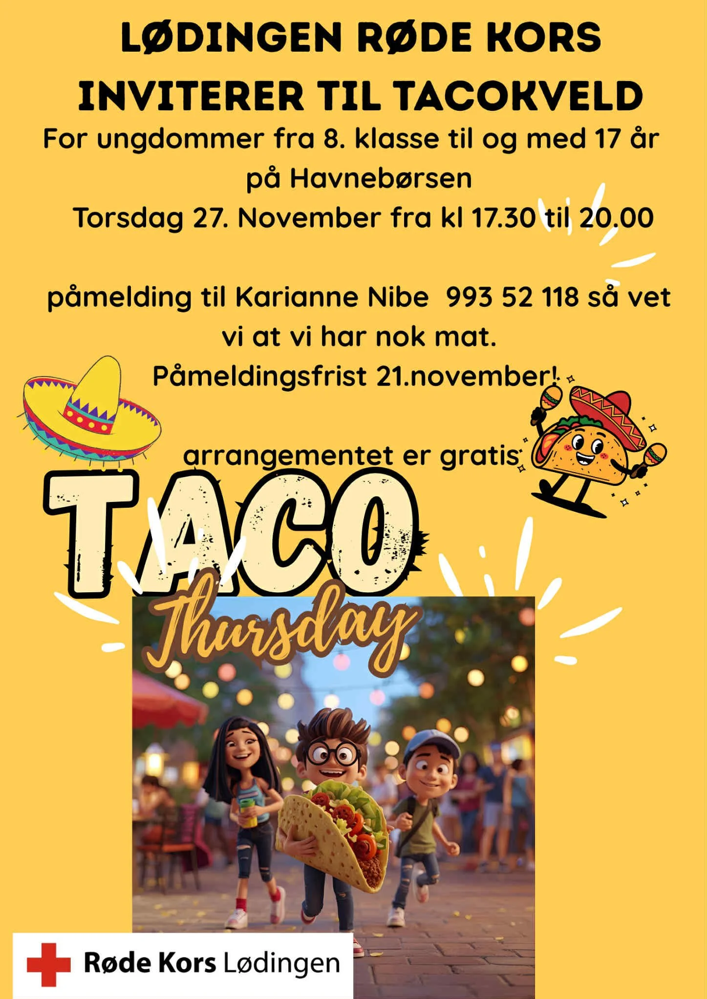 Tacokveld med Røde Kors torsdag 27. november 2025 17:30 20:00 10 Sjøvegen Lødingen, Nordland, 8410 Norway (kart) Google Calendar ICS